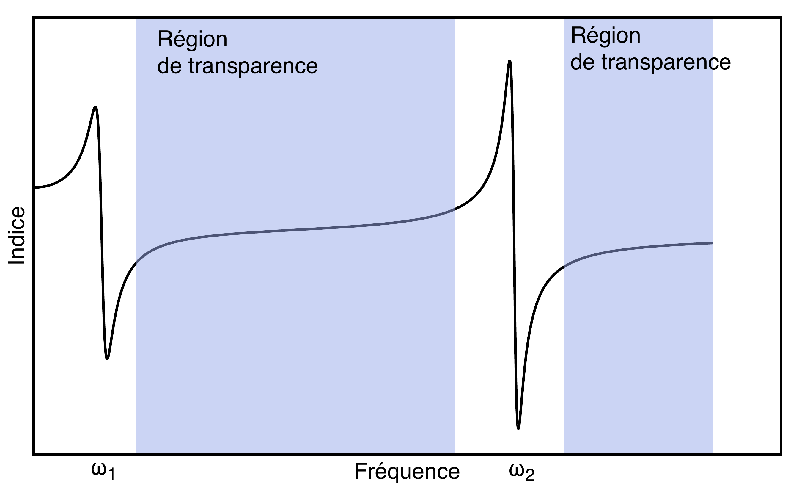 Pour obtenir une génération maximale, on utilise un matériel biréfringent pour lequel \(n_\omega = n_{2\omega}\). Ceci est possible de deux façons: on peut prendre l’onde à \(\omega\) et \(2\omega\) avec deux polarisations différentes, soit ordinaire et extraordinaire. On ajuste alors l’indice de réfraction de l’onde extraordinaire en ajustant l’angle de propagation dans le matériau (accord de phase critique). On peut aussi ajuster la température du matériau pour changer l’indice de réfraction (accord de phase non-critique).