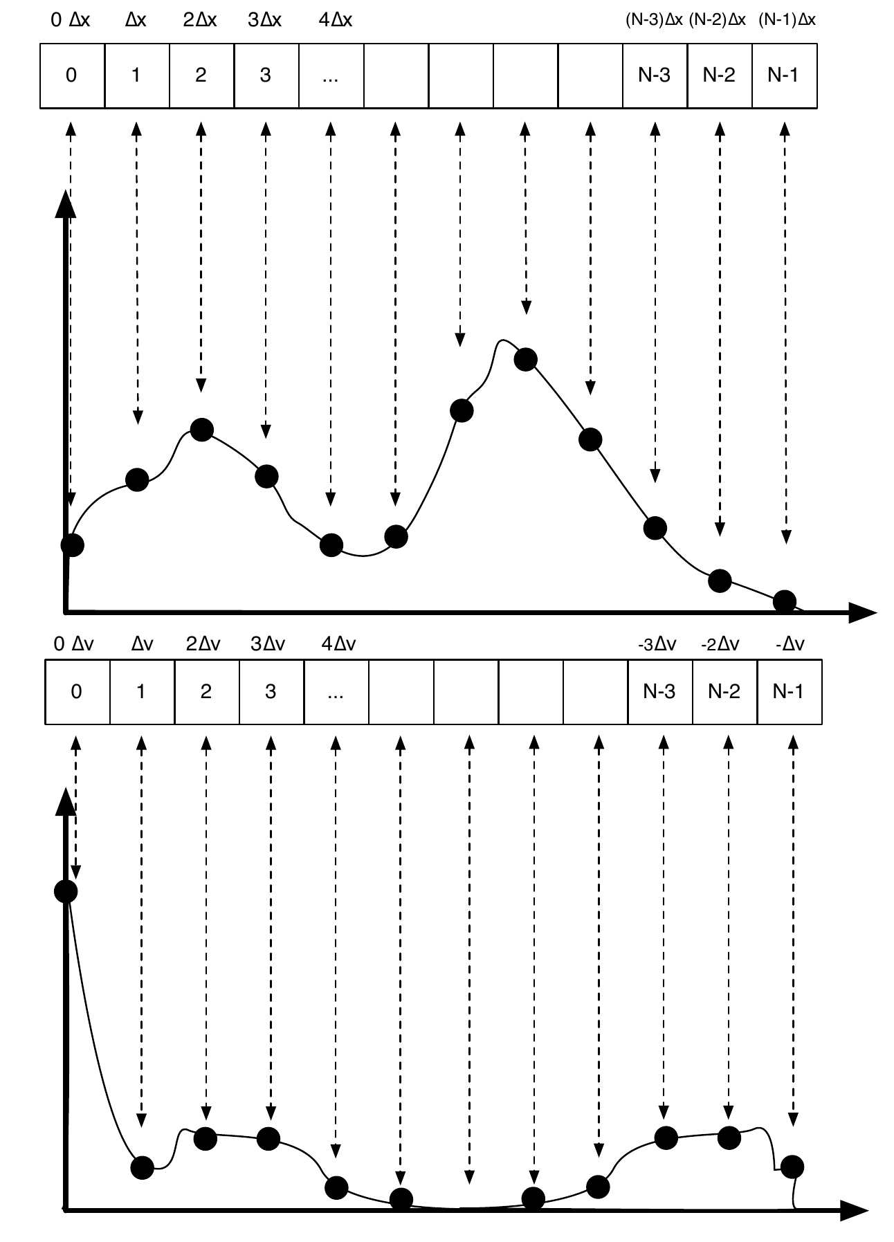 La première composante du tableau est celle correspondant à \(0 \Delta \nu\), suivie de \(\Delta \nu\), \(2 \Delta \nu\), etc... jusqu’à \((N/2) \Delta \nu\). Le dernier point du tableau est \(- \Delta \nu\), l’avant dernier est \(-2\Delta \nu\), précédé par \(-3 \Delta \nu\). Vous pourrez vérifier que le point que le dernier point du tableau est égal au deuxième, etc...