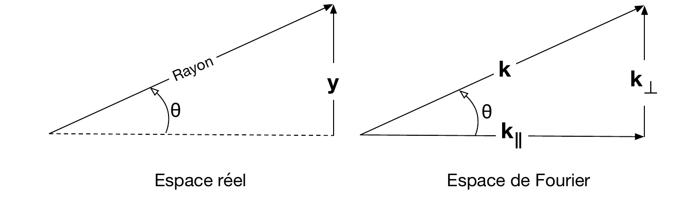 Une translation dans l’espace réel est une phase dans l’espace de Fourier: \[\begin{equation*} F(k) e^{ikx_\circ} = \int f(x-x_\circ) e^{-ikx}\, dx \end{equation*}\] Une phase dans l’espace réel est une translation dans l’espace de Fourier: \[\begin{equation*} F(k-k_\circ) = \int \left[ f(x) e^{ik_\circ x} \right] e^{-ikx}\, dx \end{equation*}\] La convolution de deux fonctions a comme transformée de Fourier le produit de leurs transformées respectives: \[\begin{equation*} \text{Si } h(u) = \int_{-\infty}^{\infty} f(x) g(u-x)\, du, \quad \text{alors } H(k) = F(k) G(k) \end{equation*}\] Le produit de deux fonctions a comme transformée de Fourier la convolution de leurs transformées: \[\begin{equation*} \text{Si } H(\nu) = \int_{-\infty}^{\infty} F(k) g(\nu-k)\, d\nu, \quad \text{alors } h(x) = f(x) g(x) \end{equation*}\]
