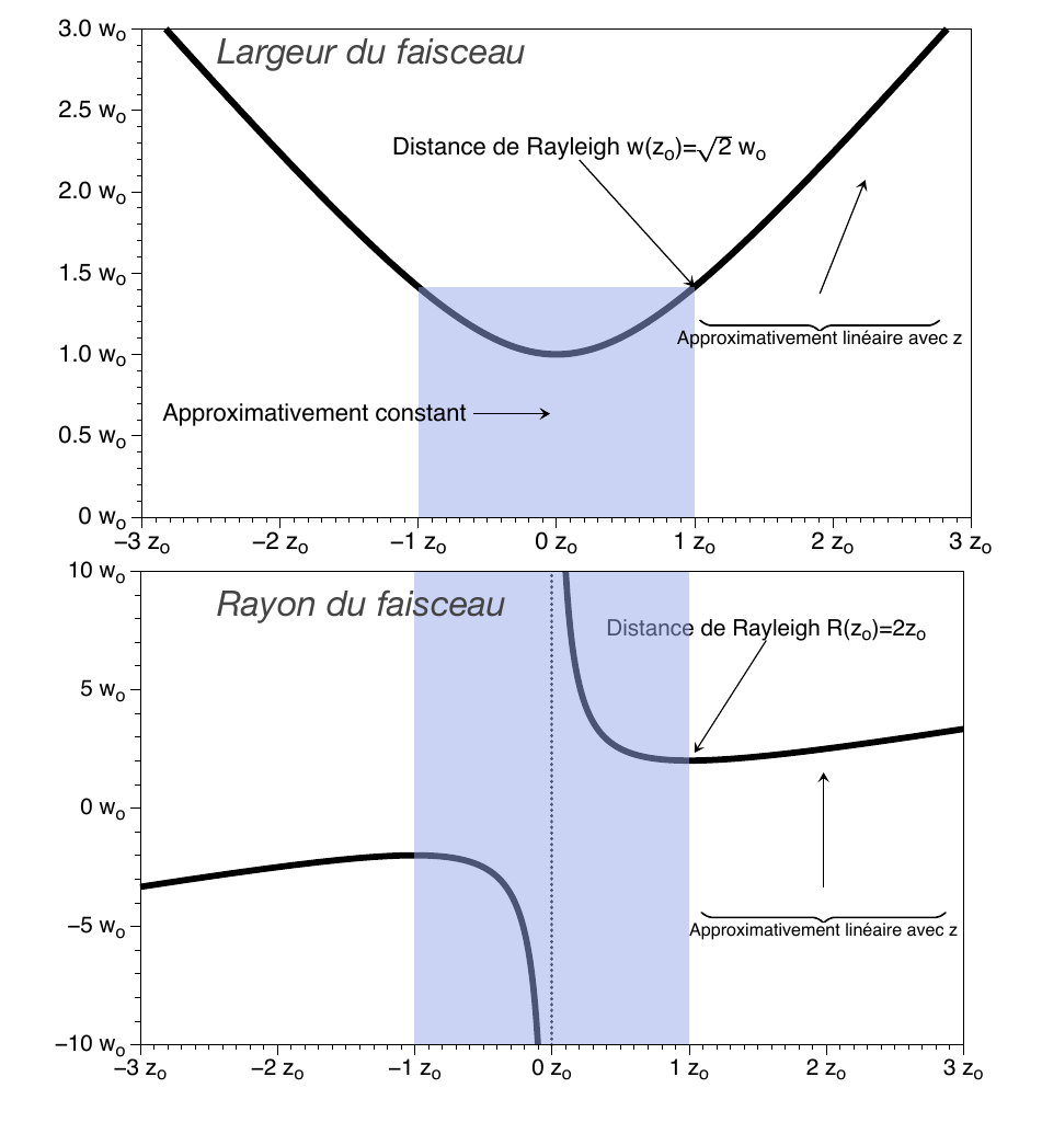 Connaître les différentes propriétés des faisceaux gaussiens: paramètre de Rayleigh (ou confocal), largeur de faisceau, rayon de courbure ;