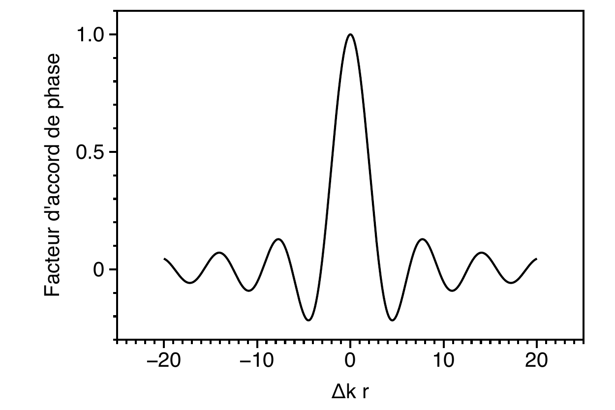Tout d’abord, on voit que le faisceau incident génère une nouvelle onde au double de la fréquence. Ce phénomène s’appelle la génération de deuxième harmonique. On fait appel à ce phénomène pour générer de nouvelles fréquences à partir d’un laser donné. On doit utiliser un cristal pour lequel le coefficient non-linéaire est élevé et qui maximise la conversion vers cette deuxième harmonique. Le terme \(\int {e^{i (\mathbf{2k_\omega - k_{2\omega}}) \cdot \mathbf{r} } d\mathbf{r}}\) est le terme d’accord de phase (ou phase-matching en anglais) qui est égal à: \[\begin{equation} \int {e^{i (\mathbf{2k_\omega - k_{2\omega}}) \cdot \mathbf{r} } d\mathbf{r}} = L \frac{\sin \left( \Delta k L\right)}{ \Delta k L} , \end{equation}\] avec \(\Delta \mathbf{k} = \mathbf{2k_\omega - k_{2\omega}} = \frac{2\omega}{c}({n_\omega - n_{2\omega}})\) et \(L\) la longueur typique du milieu non-linéaire. La fonction est maximale lorsque \(\Delta {k} L = 0\) (Figure 4.1). On obtient ceci sous une des deux conditions suivantes: